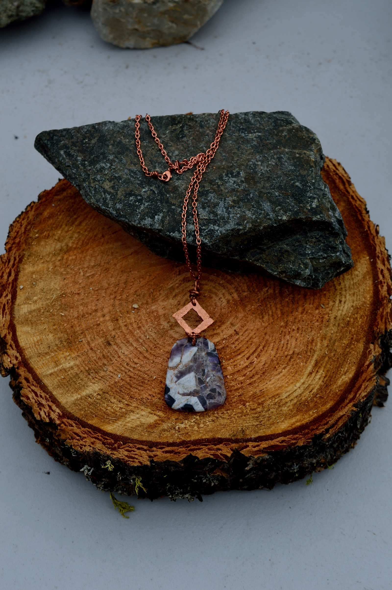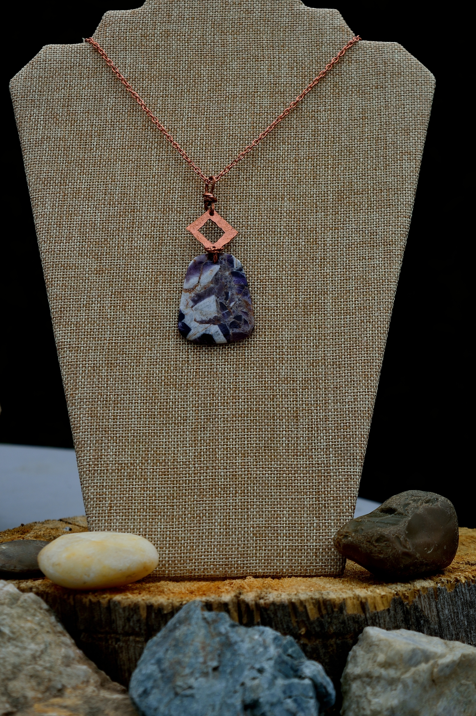 Hand cut, rectangular shaped amethyst, quartz, marblized quartz and citrine pendant with the dimesions of 1 3/4" lenth by 1 1/2" at its width