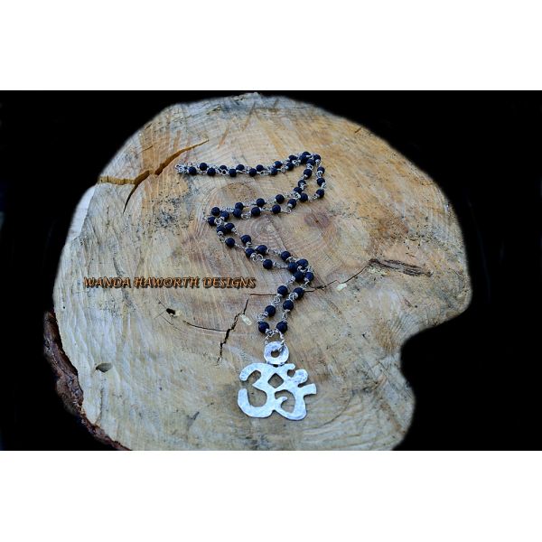 Sterling Silver ( 925) Ohm Pendant , Hand Cut and Hammered , Black Matte Finish Onyx 6 mm Bead Necklace
